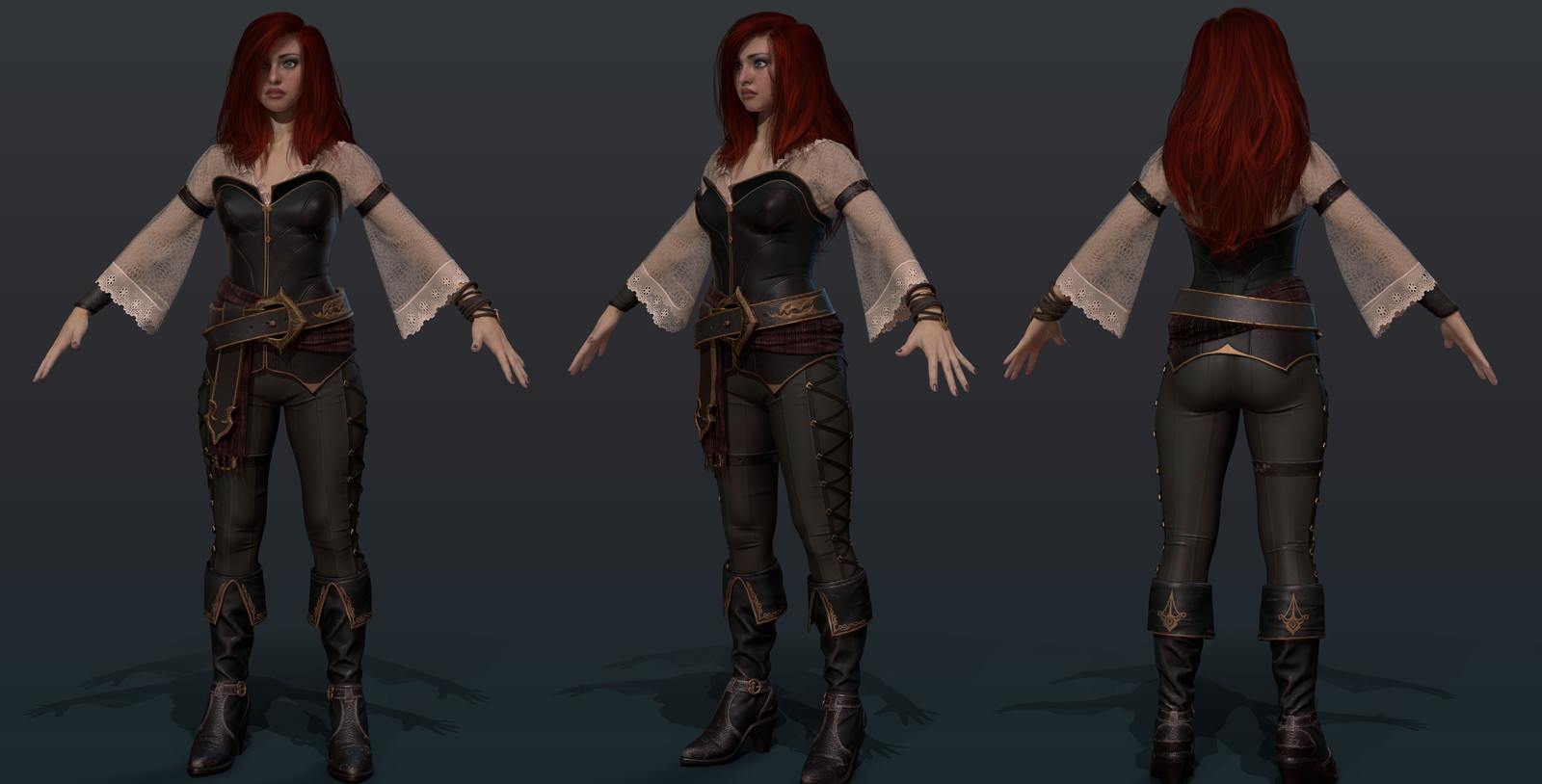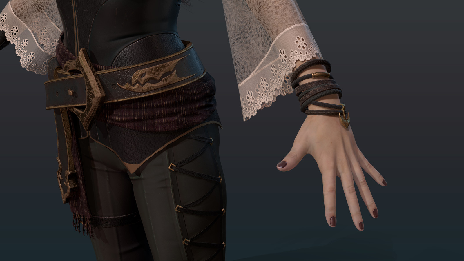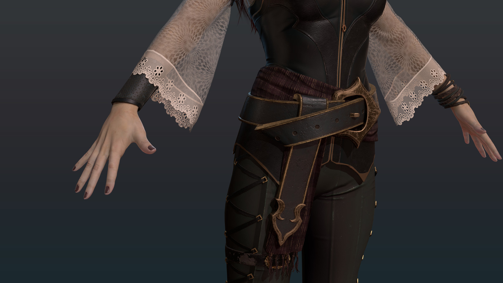 This project started as a personal study for using Texture Xyz and Mari. Having always been a fan of Riots game, I decided to work on fan art of Miss fortune from Jason Chan's League of Legends: Season Start 2018 "CLIMB" concepts. I did take the liberty to tweak the proportions and art style to realism. Either way, my goal was to create a realtime character in Marmoset toolbag and try out Texture xyz pipeline for the skin details/ textures. Apart from the skin most of the other textures were done via Substance Painter. I do have to give props to Travis Davids for the awesome fabric materials. I also used Aleksey Kudryavtsev and Maxime Conquy's substance materials for this project. The sculpt was pretty straightforward with the cloth being simulated with Marvelous designer. I used Rosemaryr's IMM Embroidery brush over the lace fabric. In regards to the eye set up in Marmoset, I used similar techniques that were shown at Unreal demo at GDC 2018.